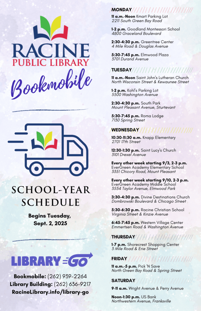 The Bookmobile stops at the locations below while school is in session, beginning Tuesday, Sept. 2, 2025. The Bookmobile is closed on all library holidays.